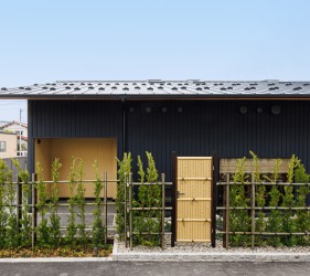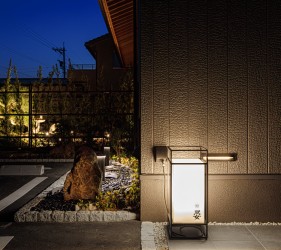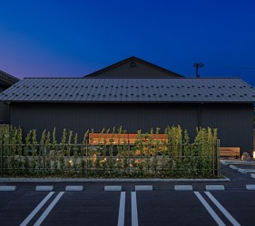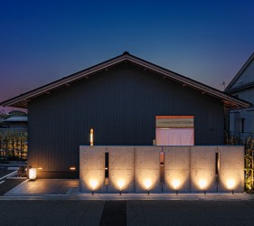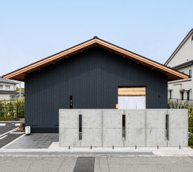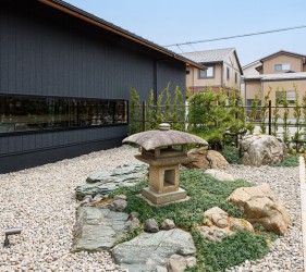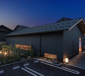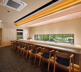 金沢市の瀟洒な住宅街に静かにたたずむ落ち着いた庭付き戸建てのすし店。外壁は焼杉をモチーフにした黒いイメージ、玄関を隠すRCの目隠し塀。サインも小さく隠家を演出した建物となっています。観光客に邪魔されず地元に愛される店を目指す小さな鮨店です。