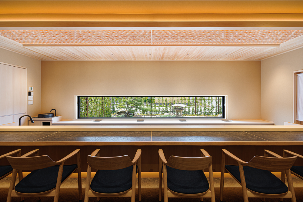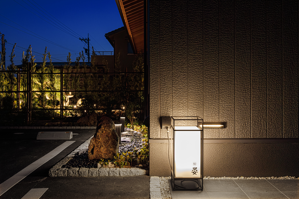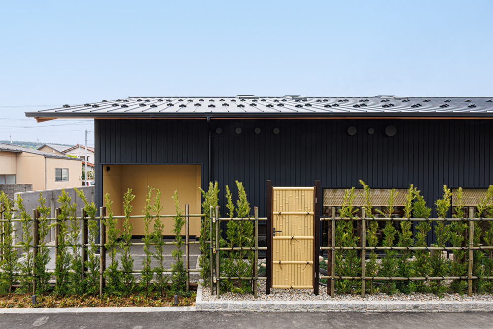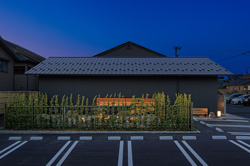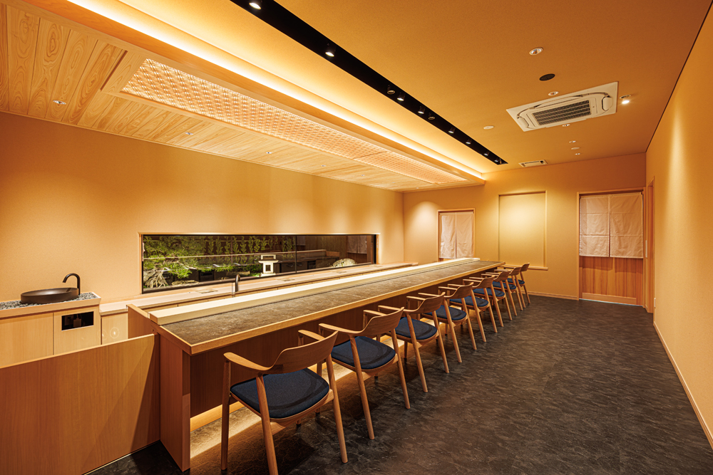 金沢市の瀟洒な住宅街に静かにたたずむ落ち着いた庭付き戸建てのすし店。外壁は焼杉をモチーフにした黒いイメージ、玄関を隠すRCの目隠し塀。サインも小さく隠家を演出した建物となっています。観光客に邪魔されず地元に愛される店を目指す小さな鮨店です。