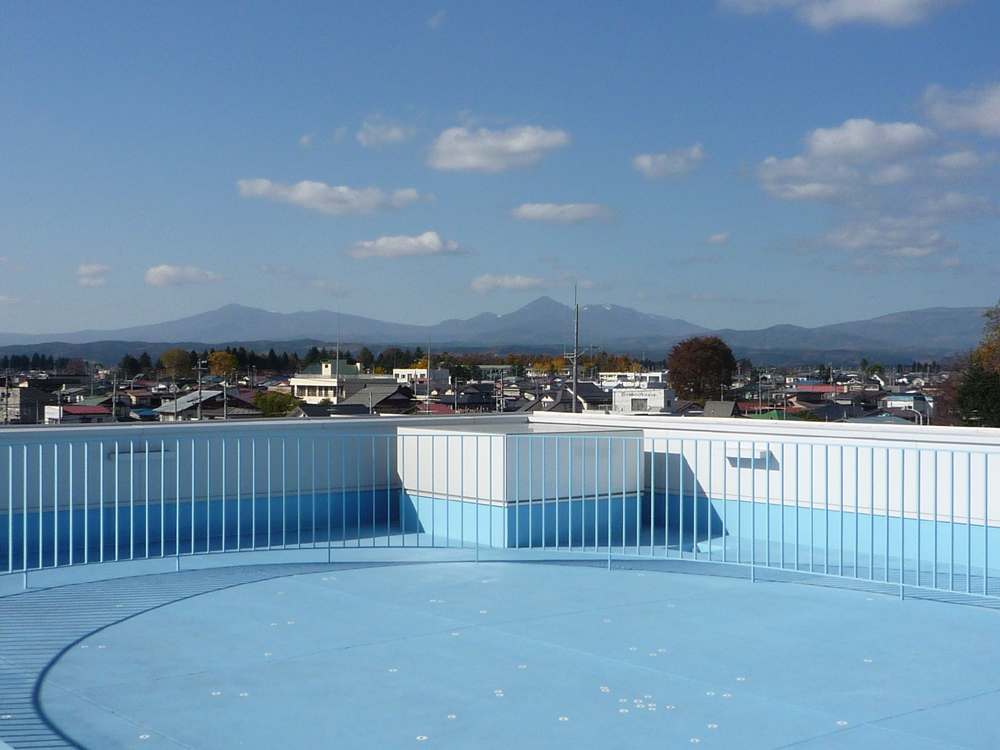 建物の屋上から見てもシンプルです、すきがない!そして遠くに見えるのが八幡平の山々です。